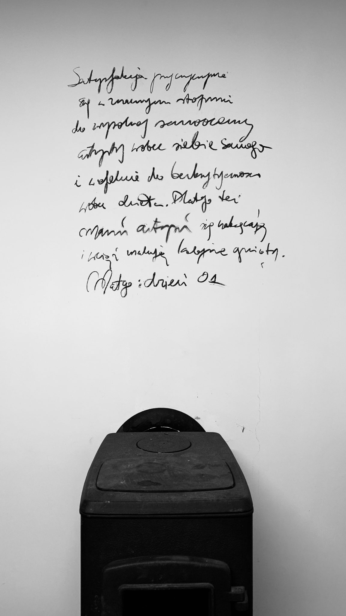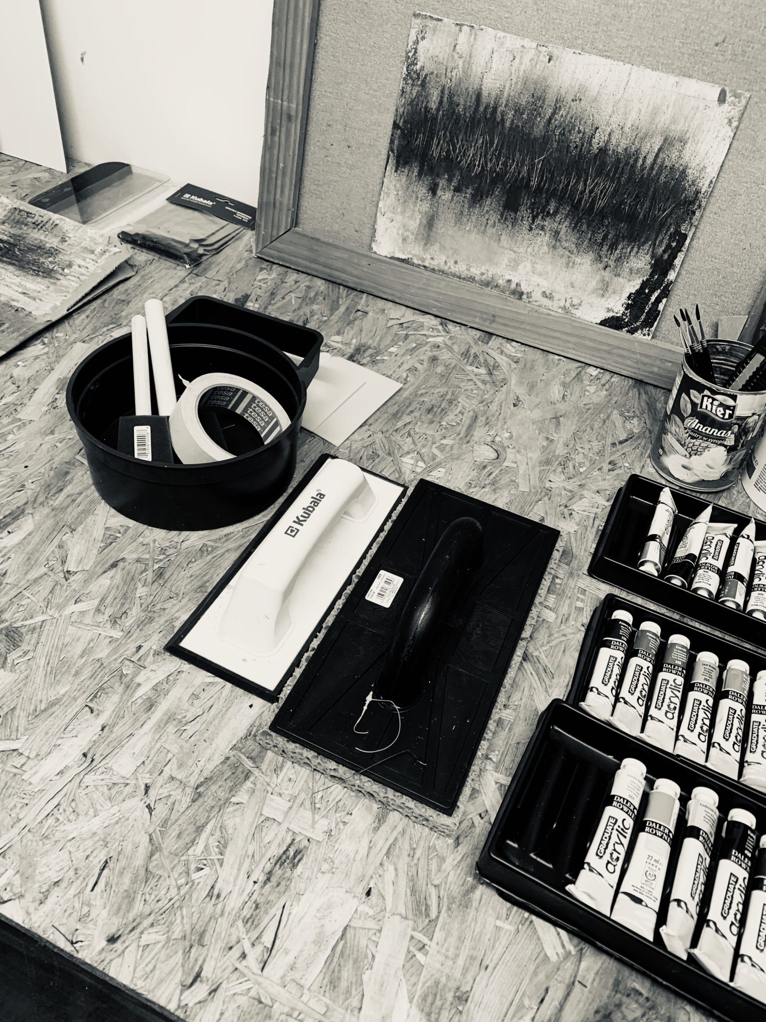 I am not surprised that in my first hour of creation I decided to paint like Jan Pruski. I have been soaking his art for 18 years, the entire length of time his works of art have been a part of Galery69. So, on a small piece of hardboard covered on one side with canvas, I spread paint with a palette knife and then scratch it with a chisel, with the end of the paintbrush, rub it with a rag, paint again. I tortured the board for two hours then I had a certain thought that I inscribed on the wall. About my own satisfaction.